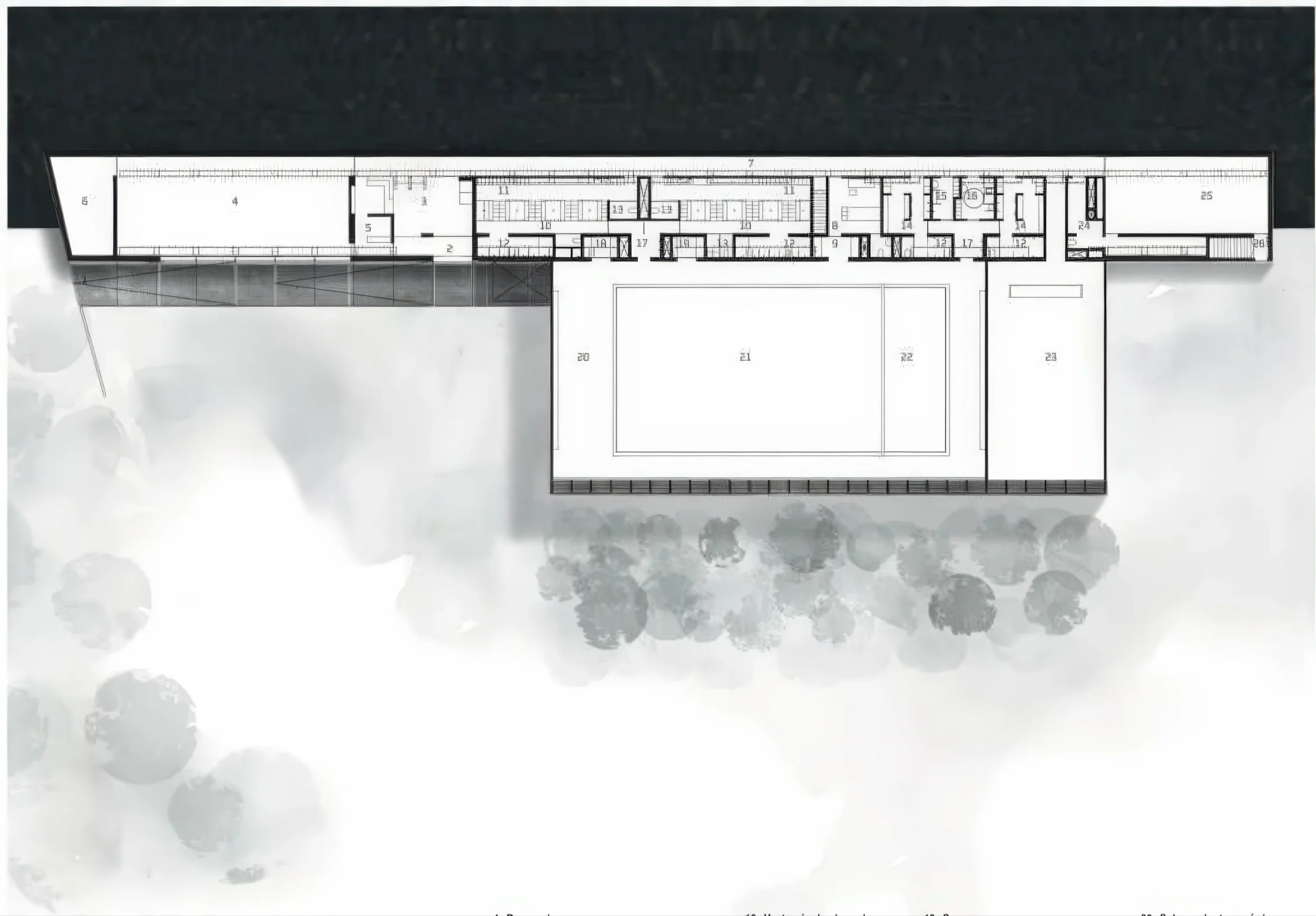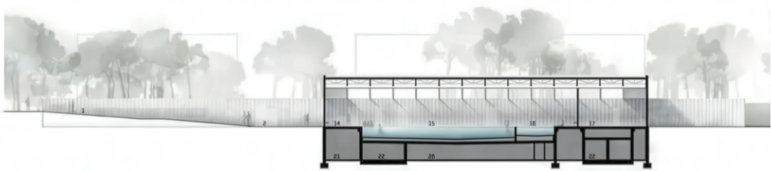 室内游泳池在塔拉德尔 Indoor Pool in Taradell | RCR 建筑事务所|RCR Arquitectes RCR 建筑事务所|RCR Arquitectes • 2025-10-30 下午12:10 • 公共建筑设计, 建筑师设计, 建筑设计, 文化建筑设计 RCR Arquitectes设计的塔拉德尔室内游泳池位于西班牙小镇体育区,巧妙利用地形创造独特空间体验。项目以低矮围墙界定边界,形成面向运动场的观景平台。垂直结构元素兼具承重与遮阳功能,更衣室置于围墙下方,水景反射模糊了节奏性柱廊的存在感,与周围松林形成和谐对话。 设计: RCR 建筑事务所|RCR Arquitectes 类型: 文化建筑设计 功能: 独立住宅 风格: 当代建筑 材料: 混凝土 钢材 玻璃 混合材料 尺度: 中型建筑 地点:西班牙 时间: 2011年 项目简介 塔拉德尔室内游泳池位于西班牙塔拉德尔小镇体育区,建筑面积约2000平方米,2011年设计建成。项目巧妙回应场地地形,为小镇提供现代化水上运动设施。 设计理念 RCR Arquitectes以地形为设计出发点,通过低矮围墙创造观景平台,垂直结构元素兼具功能与美学。建筑在两个标高间平衡,既保持街道视野通透,又为公园提供背景,体现与自然环境的和谐共生。 空间与功能 空间组织清晰分为主体泳池区、更衣区、健身区和设备区。20×12.5米主泳池与12.5×5米学习池满足不同需求,更衣室巧妙置于围墙下方,通过”脏脚走廊”实现干湿分区,确保使用流线高效合理。 材料与技术 采用RCR标志性的钢材与玻璃组合,12mm厚RCR型钢柱构成主要结构。双层自保护沥青防水层、PIR保温板等先进材料确保建筑性能。铝制格栅、搪瓷钢板等材料呼应工业美学,同时满足功能需求。 设计团队 RCR Arquitectes由Rafael Aranda、Carme Pigem和Ramon Vilalta于1988年创立,2017年获普利兹克建筑奖。事务所以对场地敏感的设计、材料创新和光影运用著称,作品深刻体现加泰罗尼亚地域特色。 项目简介 塔拉德尔室内游泳池位于西班牙塔拉德尔小镇体育区,建筑面积约2000平方米,2011年设计建成。项目巧妙回应场地地形,为小镇提供现代化水上运动设施。 设计理念 RCR Arquitectes以地形为设计出发点,通过低矮围墙创造观景平台,垂直结构元素兼具功能与美学。建筑在两个标高间平衡,既保持街道视野通透,又为公园提供背景,体现与自然环境的和谐共生。 空间与功能 空间组织清晰分为主体泳池区、更衣区、健身区和设备区。20×12.5米主泳池与12.5×5米学习池满足不同需求,更衣室巧妙置于围墙下方,通过”脏脚走廊”实现干湿分区,确保使用流线高效合理。 材料与技术 采用RCR标志性的钢材与玻璃组合,12mm厚RCR型钢柱构成主要结构。双层自保护沥青防水层、PIR保温板等先进材料确保建筑性能。铝制格栅、搪瓷钢板等材料呼应工业美学,同时满足功能需求。 设计团队 RCR Arquitectes由Rafael Aranda、Carme Pigem和Ramon Vilalta于1988年创立,2017年获普利兹克建筑奖。事务所以对场地敏感的设计、材料创新和光影运用著称,作品深刻体现加泰罗尼亚地域特色。 本文来自 © RCR 建筑事务所|RCR Arquitectes, 发布于 © 建筑学院官方网站。 未经授权,禁止转载或摘编。 编辑版本版权归 © 建筑学院官方网站 所有, 设计、图纸及照片版权归设计方 © RCR 建筑事务所|RCR Arquitectes ↗ 所有。 查看作者在建筑学院发布的更多作品: RCR 建筑事务所|RCR Arquitectes @ 建筑学院官方网站 RCR Arquitectes体育建筑塔拉德尔室内游泳池西班牙建筑钢结构 RCR 建筑事务所|RCR Arquitectes事务所 & 设计师 下载原图 收藏 0 关于作者 RCR 建筑事务所|RCR Arquitectes事务所 & 设计师 关注私信 14 文章 0 评论 0 粉丝 RCR建筑事务所由拉斐尔·阿兰达、卡莫·皮格姆和拉蒙·比拉尔塔于1988年在西班牙奥洛特创立。他们于2017年共同荣获普利兹克建筑奖,其作品以根植本土、心向世界而闻名。事务所擅长运用耐候钢、玻璃等现代材料,将建筑与自然景观深度融合,创造出充满诗意与永恒感的空间。其代表作包括法国苏拉吉博物馆、里拉剧院户外空间等。 迪拜穆拉巴公寓楼 Muraba Residences in Dubai | RCR 建筑事务所|RCR Arquitectes 上一篇 2025-10-30 下午12:10 芝加哥当代艺术博物馆 Museum of Contemporary Art Chicago | MARKLEE 建筑事务所|MARKLEE 下一篇 2025-10-31 上午12:35 猜你喜欢 勒哈弗多功能社会文化体育设施 Multifunction Sociocultural and Sports Facility, Le Havre | 布鲁瑟建筑事务所|Bruther 2025-11-24 公共建筑设计 电子工坊 | RCR Architects 2025-09-05 住宅建筑设计 阿尔盖河划馆 Rowing Pavilion in Alange | 何塞·玛丽亚·桑切斯·加西亚|José María Sánchez García 2025-11-30 公共建筑设计 RBC设计中心,蒙彼利埃 RBC Design Centre, Montpellier | 让·努维尔建筑事务所|Jean Nouvel 2025-12-03 公共建筑设计 男卡泽住宅 / Malecaze House | RCR 建筑事务所 2025-11-17 公共建筑设计 卡马之家和艾瓦哈之家 / Kama House and Alwah House | RCR 建筑事务所 2025-11-13 公共建筑设计 发表回复 请登录后评论...登录后才能评论 提交