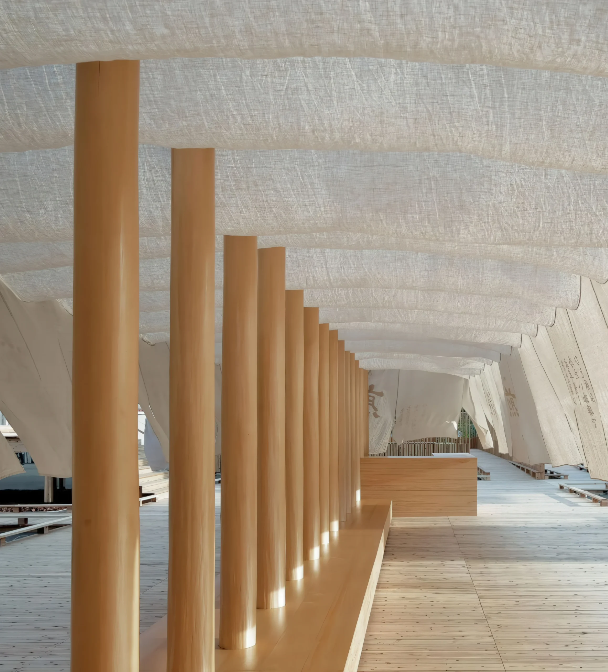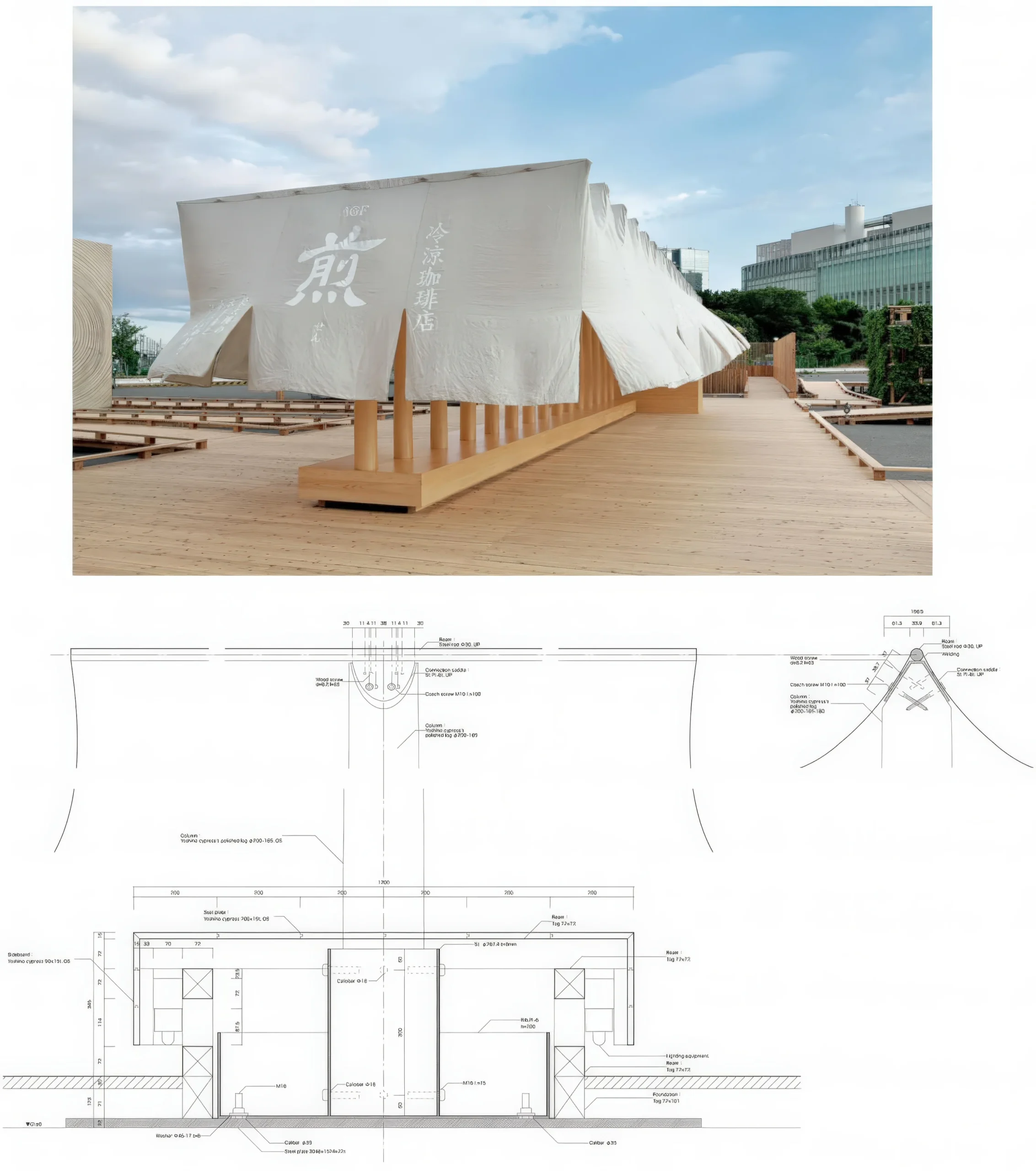 东京冰咖啡店 / Iced Coffee Shop, Tokyo | 长谷川豪建筑事务所 长谷川豪建筑事务所|Go Hasegawa • 2025-11-01 上午8:50 • 公共建筑设计, 建筑师设计, 建筑设计, 文化建筑设计 东京冰咖啡店由长谷川豪建筑事务所为2016年东京湾House Vision展览设计,是一个临时休息空间。设计采用麻布遮篷结构,灵感来自传统咖啡麻袋,在炎热夏季创造通风凉爽的环境。T形钢木结构与悬挂麻布帘形成轻盈的半室内外空间,模糊建筑与家具的界限。 设计: 长谷川豪建筑事务所|Go Hasegawa 类型: 文化建筑设计 功能: 展览馆 风格: 当代建筑 材料: 钢材 木材 织物 尺度: 小型建筑 地点:东京 时间: 2016年 项目概述 东京冰咖啡店是长谷川豪建筑事务所为2016年东京湾House Vision展览设计的临时休息空间,位于日本东京湾。该项目作为展览配套的咖啡休息区,采用轻质临时结构,设计建成年份为2016年。 设计理念 长谷川豪建筑事务所从传统咖啡麻袋中汲取灵感,旨在在炎热夏季创造清凉通风的休憩环境。设计回应东京湾夏季高温气候,通过轻盈的遮篷结构营造树荫般的庇护感,同时满足展览对半室外空间的需求。 空间与功能 东京冰咖啡店采用线性排列的T形结构,柱梁间距80厘米,形成开放流动的空间体验。结构兼具家具功能,柱基作为座椅,支柱作为靠背,创造半私密半公共的休憩区域。悬挂的麻布帘自然下垂形成悬链曲线,界定空间边界而不封闭视线。 材料与技术 项目采用30毫米直径钢梁与木材支柱组成的T形结构体系,覆盖麻布织物帘幕。材料选择强调临时性与轻质性,钢木组合结构确保稳定性,麻布帘幕提供遮阳与通风,体现可持续的临时建筑策略。 项目特色与启发 东京冰咖啡店展示了临时建筑如何通过简单材料与结构创造丰富的空间体验。长谷川豪建筑事务所的设计模糊了建筑与家具的界限,为展览建筑、临时构筑物设计提供了创新思路,特别是在有限预算与短暂周期下的空间营造方法。 设计团队 长谷川豪建筑事务所由日本建筑师长谷川豪创立,以细腻的空间感知与材料运用著称。事务所在住宅、文化建筑与临时装置领域具有丰富经验,擅长通过简约手法创造富有诗意的建筑体验,东京冰咖啡店体现了其对空间轻量化与人性化设计的探索。 项目概述 东京冰咖啡店是长谷川豪建筑事务所为2016年东京湾House Vision展览设计的临时休息空间,位于日本东京湾。该项目作为展览配套的咖啡休息区,采用轻质临时结构,设计建成年份为2016年。 设计理念 长谷川豪建筑事务所从传统咖啡麻袋中汲取灵感,旨在在炎热夏季创造清凉通风的休憩环境。设计回应东京湾夏季高温气候,通过轻盈的遮篷结构营造树荫般的庇护感,同时满足展览对半室外空间的需求。 空间与功能 东京冰咖啡店采用线性排列的T形结构,柱梁间距80厘米,形成开放流动的空间体验。结构兼具家具功能,柱基作为座椅,支柱作为靠背,创造半私密半公共的休憩区域。悬挂的麻布帘自然下垂形成悬链曲线,界定空间边界而不封闭视线。 材料与技术 项目采用30毫米直径钢梁与木材支柱组成的T形结构体系,覆盖麻布织物帘幕。材料选择强调临时性与轻质性,钢木组合结构确保稳定性,麻布帘幕提供遮阳与通风,体现可持续的临时建筑策略。 项目特色与启发 东京冰咖啡店展示了临时建筑如何通过简单材料与结构创造丰富的空间体验。长谷川豪建筑事务所的设计模糊了建筑与家具的界限,为展览建筑、临时构筑物设计提供了创新思路,特别是在有限预算与短暂周期下的空间营造方法。 设计团队 长谷川豪建筑事务所由日本建筑师长谷川豪创立,以细腻的空间感知与材料运用著称。事务所在住宅、文化建筑与临时装置领域具有丰富经验,擅长通过简约手法创造富有诗意的建筑体验,东京冰咖啡店体现了其对空间轻量化与人性化设计的探索。 本文来自 © 长谷川豪建筑事务所|Go Hasegawa, 发布于 © 建筑学院官方网站。 未经授权,禁止转载或摘编。 编辑版本版权归 © 建筑学院官方网站 所有, 设计、图纸及照片版权归设计方 © 长谷川豪建筑事务所|Go Hasegawa ↗ 所有。 查看作者在建筑学院发布的更多作品: 长谷川豪建筑事务所|Go Hasegawa @ 建筑学院官方网站 Iced Coffee Shop Tokyo东京展览建筑临时建筑长谷川豪建筑事务所 长谷川豪建筑事务所|Go Hasegawa事务所 & 设计师 下载原图 收藏 0 关于作者 长谷川豪建筑事务所|Go Hasegawa事务所 & 设计师 关注私信 16 文章 0 评论 0 粉丝 长谷川豪建筑事务所(Go Hasegawa)由日本建筑师长谷川豪于2005年创立,以其对空间尺度的独特探索和建筑与自然、城市环境的巧妙融合而闻名。其代表作"樱台之家"以一张巨大桌子重新定义住宅核心,"林中飞屋"则通过架空结构实现与树冠平齐的居住体验。事务所作品强调打破建筑内外界限,营造既亲密又开放的动态空间。 圣瓦伦霍夫公寓和办公大楼 / Stavenhof Apartment and Office Building | 布兰德胡伯建筑事务所|Brandlhuber 上一篇 2025-11-01 上午8:50 观“宅 View House | MARKLEE 建筑事务所|MARKLEE 下一篇 2025-11-01 上午8:50 猜你喜欢 komazawa之家 / House in Komazawa | 长谷川豪建筑事务所 2025-11-24 公共建筑设计 公寓在 Nerima / Apartments in Nerima | 长谷川豪建筑事务所|Go Hasegawa 2025-11-25 公共建筑设计 深圳中心公园指挥部 / 一树建筑 2023-10-18 办公建筑设计 10天,火神山医院是这样建成的 2020-02-03 建筑设计 Ageo的排房 /