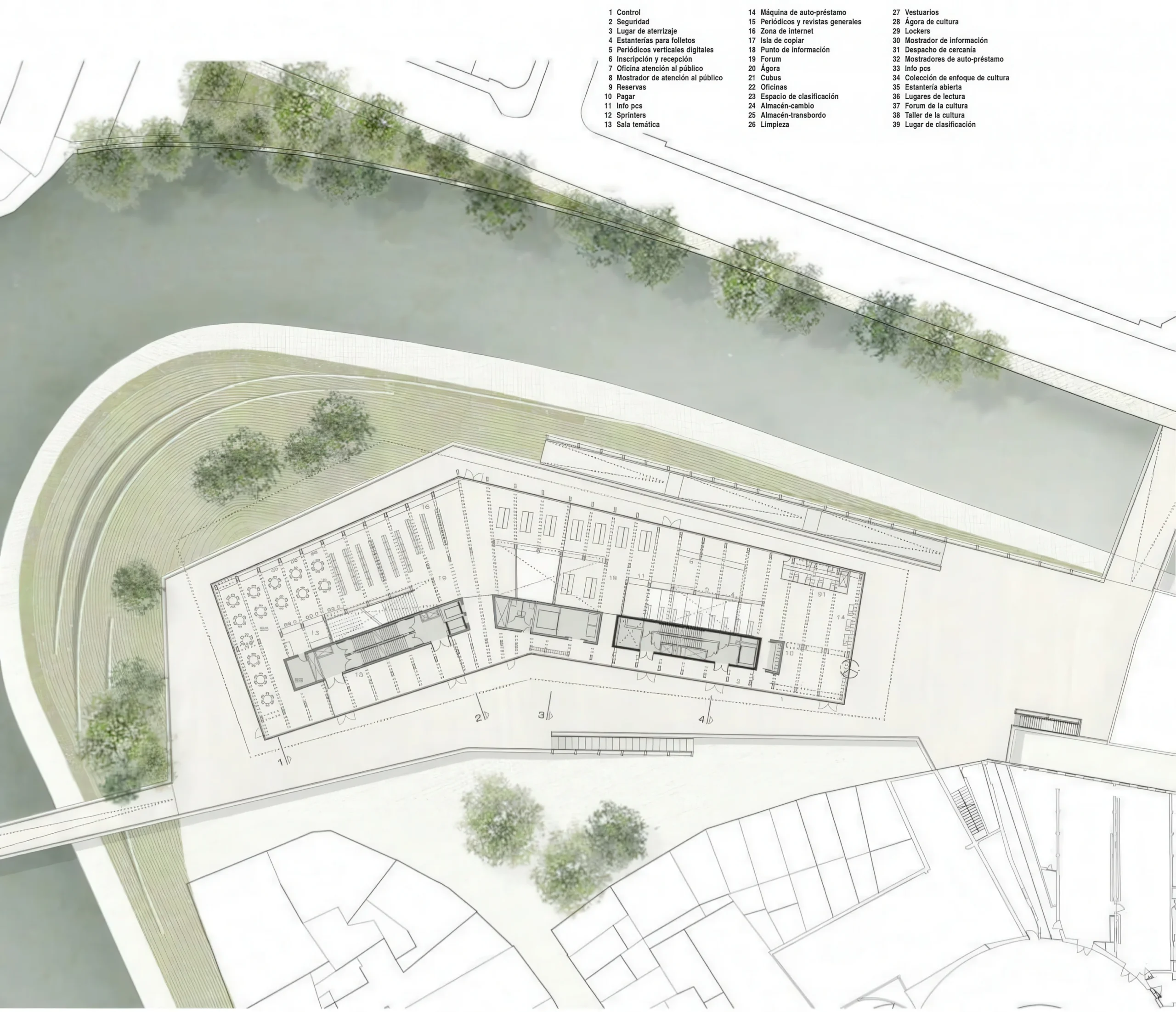 克罗洛克图书馆 / De Krook Library | RCR 建筑事务所|RCR Arquitectes RCR 建筑事务所|RCR Arquitectes • 2025-11-15 上午8:50 • 公共建筑设计, 建筑师设计, 建筑设计, 文化建筑设计 克罗洛克图书馆由RCR建筑事务所设计,位于比利时根特市,是一座集图书馆、新媒体中心、儿童青少年活动空间于一体的文化教育建筑。项目巧妙回应城市运河地形,通过多层次公共空间与流线组织,创造丰富的垂直与水平连接体验。 设计: RCR 建筑事务所|RCR Arquitectes 类型: 文化建筑设计 功能: 图书馆 风格: 当代建筑 材料: 混凝土 钢材 玻璃 金属板 尺度: 微型建筑与装置 地点:根特 时间: 2009年 项目概述 克罗洛克图书馆(De Krook Library)位于比利时根特市,是一座综合性文化教育建筑,包含图书馆、新媒体中心、多功能教室、儿童青少年活动区等功能。项目由RCR建筑事务所设计,建筑面积规模宏大,建成年份为近期。 设计理念 RCR建筑事务所以根特城市运河(Krook)为设计灵感,回应场地特有的双重标高特征——运河水面与城市桥梁。建筑形体追随运河流动轨迹,通过扭转与错动创造动态空间关系,强化建筑与城市脉络的连接。 空间与功能 克罗洛克图书馆以双层高度的中央广场为核心,组织垂直交通与水平流线。各楼层功能明确:地下层为儿童图书馆,地面层设置主入口广场与咖啡厅,上层分布知识图书馆、文化图书馆及大学办公区。空间通过开放式布局、阅读阶梯与观景平台,营造多样化的学习与交流场所。 材料与技术 建筑主要采用钢材、混凝土与玻璃,外立面以青铜色铝合金百叶为特色,兼顾遮阳与立面韵律。结构体系清晰,采用钢柱、钢梁与混凝土楼板,配合金属格栅地面、可调节技术地板等细节,体现高完成度的建造品质。 项目特色与启发 克罗洛克图书馆展示了文化建筑如何整合复杂功能、呼应城市文脉,并通过灵活的空间组织促进公共互动。RCR建筑事务所在本项目中的设计策略,为当代教育文化类建筑提供了空间整合与地形回应的参考范例。 设计团队 RCR建筑事务所(RCR Arquitectes)由Rafael Aranda、Carme Pigem与Ramon Vilalta于1988年创立,以对场地、材料与光线的敏锐感知著称,作品涵盖文化、教育、公共建筑等多个领域,曾获普利兹克建筑奖等国际荣誉。 项目概述 克罗洛克图书馆(De Krook Library)位于比利时根特市,是一座综合性文化教育建筑,包含图书馆、新媒体中心、多功能教室、儿童青少年活动区等功能。项目由RCR建筑事务所设计,建筑面积规模宏大,建成年份为近期。 设计理念 RCR建筑事务所以根特城市运河(Krook)为设计灵感,回应场地特有的双重标高特征——运河水面与城市桥梁。建筑形体追随运河流动轨迹,通过扭转与错动创造动态空间关系,强化建筑与城市脉络的连接。 空间与功能 克罗洛克图书馆以双层高度的中央广场为核心,组织垂直交通与水平流线。各楼层功能明确:地下层为儿童图书馆,地面层设置主入口广场与咖啡厅,上层分布知识图书馆、文化图书馆及大学办公区。空间通过开放式布局、阅读阶梯与观景平台,营造多样化的学习与交流场所。 材料与技术 建筑主要采用钢材、混凝土与玻璃,外立面以青铜色铝合金百叶为特色,兼顾遮阳与立面韵律。结构体系清晰,采用钢柱、钢梁与混凝土楼板,配合金属格栅地面、可调节技术地板等细节,体现高完成度的建造品质。 项目特色与启发 克罗洛克图书馆展示了文化建筑如何整合复杂功能、呼应城市文脉,并通过灵活的空间组织促进公共互动。RCR建筑事务所在本项目中的设计策略,为当代教育文化类建筑提供了空间整合与地形回应的参考范例。 设计团队 RCR建筑事务所(RCR Arquitectes)由Rafael Aranda、Carme Pigem与Ramon Vilalta于1988年创立,以对场地、材料与光线的敏锐感知著称,作品涵盖文化、教育、公共建筑等多个领域,曾获普利兹克建筑奖等国际荣誉。 本文来自 © RCR 建筑事务所|RCR Arquitectes, 发布于 © 建筑学院官方网站。 未经授权,禁止转载或摘编。 编辑版本版权归 © 建筑学院官方网站 所有, 设计、图纸及照片版权归设计方 © RCR 建筑事务所|RCR Arquitectes ↗ 所有。 查看作者在建筑学院发布的更多作品: RCR 建筑事务所|RCR Arquitectes @ 建筑学院官方网站 De Krook LibraryRCR Arquitectes文化建筑根特文化建筑 RCR 建筑事务所|RCR Arquitectes事务所 & 设计师 下载原图 收藏 0 关于作者 RCR 建筑事务所|RCR Arquitectes事务所 & 设计师 关注私信 14 文章 0 评论 0 粉丝 RCR建筑事务所由拉斐尔·阿兰达、卡莫·皮格姆和拉蒙·比拉尔塔于1988年在西班牙奥洛特创立。他们于2017年共同荣获普利兹克建筑奖,其作品以根植本土、心向世界而闻名。事务所擅长运用耐候钢、玻璃等现代材料,将建筑与自然景观深度融合,创造出充满诗意与永恒感的空间。其代表作包括法国苏拉吉博物馆、里拉剧院户外空间等。 弗恩斯住宅,克鲁姆赫希 / House by the Fens, Krumbach | 贝尔纳多·巴德尔|Bernardo Bader 上一篇 2025-11-14 下午12:50 码房 Barcode House / Barcode House | MVRDV 建筑事务所 下一篇 2025-11-15 下午12:50 猜你喜欢 室内游泳池在塔拉德尔 Indoor Pool in Taradell | RCR 建筑事务所|RCR Arquitectes 2025-10-30 公共建筑设计 诺贝尔中心 Nobel Center | 大卫·奇珀菲尔德建筑事务所|David Chipperfield 2025-11-13 公共建筑设计 伯格曼中心基金会 Bergman Center Foundation | 谭姆与维德高德建筑事务所|Tham & Videgård 2025-11-16 公