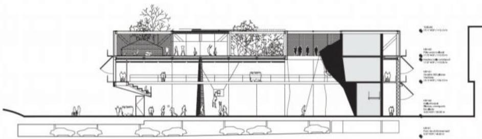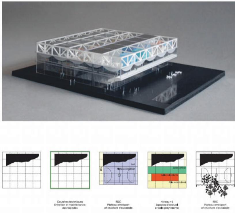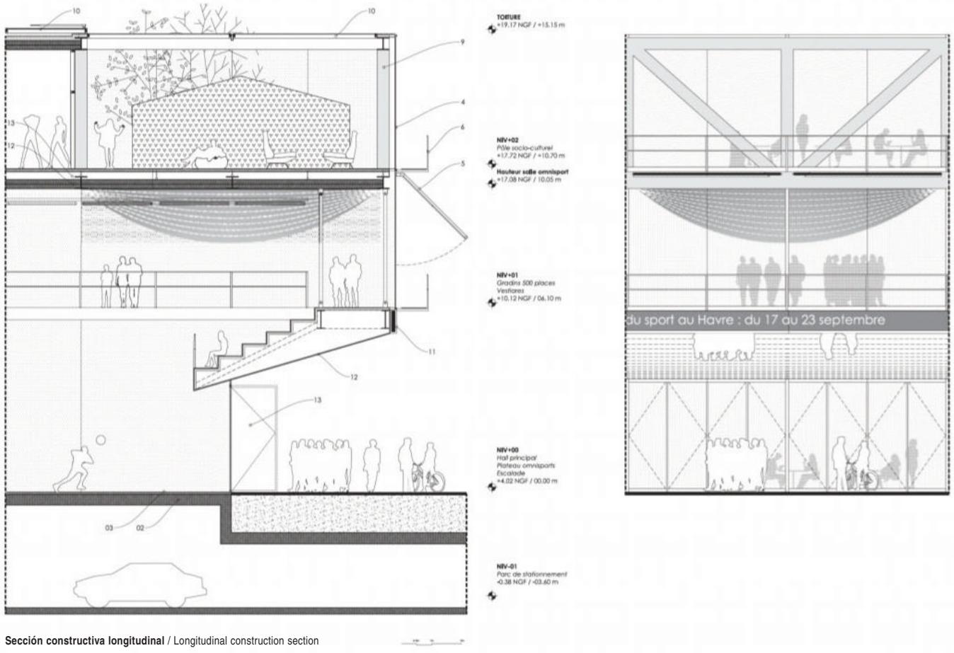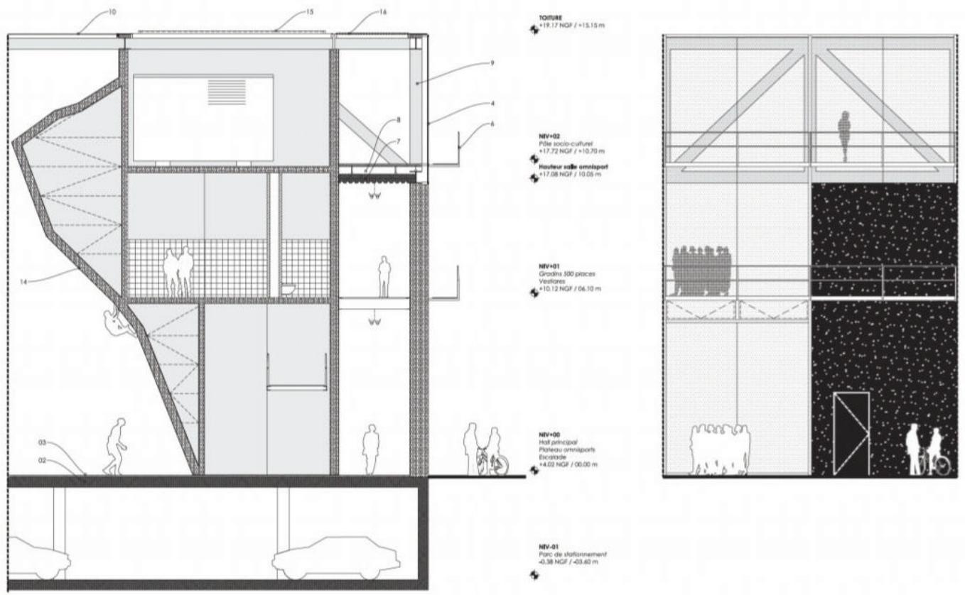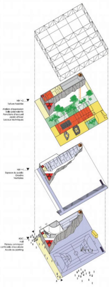 勒哈弗多功能社会文化体育设施 Multifunction Sociocultural and Sports Facility, Le Havre | 布鲁瑟建筑事务所|Bruther 布鲁瑟建筑事务所|Bruther • 2025-11-24 下午12:50 • 公共建筑设计, 建筑师, 建筑设计, 文化建筑设计 勒哈弗多功能社会文化体育设施位于法国勒哈弗市丹东区,由布鲁瑟建筑事务所设计,2015年建成。该项目巧妙整合体育场馆、社会文化中心和攀岩墙等多元功能,通过垂直叠加的空间策略,在有限场地内创造出高效复合的社区公共空间。 设计: 布鲁瑟建筑事务所|Bruther 类型: 文化建筑设计 功能: 文化中心 风格: 现代主义 材料: 混凝土 钢材 玻璃 尺度: 中型建筑 地点:法国 时间: 2015年 项目简介 勒哈弗多功能社会文化体育设施位于法国勒哈弗市丹东区,是一座集体育、文化、休闲功能于一体的综合性建筑。项目占地面积约2576平方米,建筑面积未公开,设计于2015年完成。 设计理念 设计团队采用”庇护所与观景台”的双重建筑原型概念,通过垂直叠加不同功能空间的策略,在有限的矩形场地内实现功能的最大化整合。建筑以棱柱体量统一整体形象,内部功能分层布置,形成清晰的空间逻辑。 空间与功能 底层为多功能体育馆,设有500座观众席,面向城市开放;上层社会文化中心利用体育馆9米层高优势,设置展览空间、多功能厅和冬季花园;攀岩墙作为连接元素,贯穿两个主要功能区。地下设有公共停车场。 材料与技术 建筑采用钢结构框架和玻璃幕墙系统,外立面设置可调节遮阳装置。体育馆地面采用石英砂找平层配合地暖系统,攀岩墙采用混凝土喷射工艺。建筑注重自然采光与通风的可持续设计。 设计团队 布鲁瑟建筑事务所是法国知名建筑设计团队,以理性主义设计方法和创新空间策略著称,擅长处理复杂功能整合与城市公共空间的融合。 项目简介 勒哈弗多功能社会文化体育设施位于法国勒哈弗市丹东区,是一座集体育、文化、休闲功能于一体的综合性建筑。项目占地面积约2576平方米,建筑面积未公开,设计于2015年完成。 设计理念 设计团队采用”庇护所与观景台”的双重建筑原型概念,通过垂直叠加不同功能空间的策略,在有限的矩形场地内实现功能的最大化整合。建筑以棱柱体量统一整体形象,内部功能分层布置,形成清晰的空间逻辑。 空间与功能 底层为多功能体育馆,设有500座观众席,面向城市开放;上层社会文化中心利用体育馆9米层高优势,设置展览空间、多功能厅和冬季花园;攀岩墙作为连接元素,贯穿两个主要功能区。地下设有公共停车场。 材料与技术 建筑采用钢结构框架和玻璃幕墙系统,外立面设置可调节遮阳装置。体育馆地面采用石英砂找平层配合地暖系统,攀岩墙采用混凝土喷射工艺。建筑注重自然采光与通风的可持续设计。 设计团队 布鲁瑟建筑事务所是法国知名建筑设计团队,以理性主义设计方法和创新空间策略著称,擅长处理复杂功能整合与城市公共空间的融合。 本文来自 © 布鲁瑟建筑事务所|Bruther, 发布于 © 建筑学院官方网站。 未经授权,禁止转载或摘编。 编辑版本版权归 © 建筑学院官方网站 所有, 设计、图纸及照片版权归设计方 © 布鲁瑟建筑事务所|Bruther ↗ 所有。 查看作者在建筑学院发布的更多作品: 布鲁瑟建筑事务所|Bruther @ 建筑学院官方网站 勒哈弗多功能社会文化体育设施布鲁瑟建筑事务所文化综合体法国勒哈弗钢结构 布鲁瑟建筑事务所|Bruther事务所 & 设计师 下载原图 收藏 0 关于作者 布鲁瑟建筑事务所|Bruther事务所 & 设计师 关注私信 20 文章 0 评论 1 粉丝 布鲁瑟建筑事务所(Bruther)由亚历克西斯·博德与斯蒂芬妮·布鲁诺创立于巴黎,是当代极具前瞻性的先锋建筑团队。他们以“动态功能”与“空间灵活性”为核心,作品横跨文化、教育及研究建筑领域,以前瞻性思维与技术精确性,创造出开放、适应性强且充满张力的建筑,持续拓展建筑实践的边界,重新定义当代建筑语言。 圣罗伦索纽约新店 Valentino New York | 大卫·奇珀菲尔德建筑事务所|David Chipperfield 上一篇 2025-11-24 上午8:50 Bötzow啤酒厂的改造 Conversion of Bötzow Brewery | 大卫·奇珀菲尔德建筑事务所|David Chipperfield 下一篇 2025-11-25 上午12:50 猜你喜欢 Cuatro Caminos Transport Interchange | 曼努埃尔·塞万提斯|Manuel Cervantes 2025-12-09 交通建筑设计 电子工坊 | RCR Architects 2025-09-05 住宅建筑设计 布列塔尼街14套住宅 14 Housing Units on Rue des Bergers | 布鲁瑟建筑事务所|Bruther 2025-11-28 公共建筑设计 巴西贝萨雷斯保护区两座房子 | 曼努埃尔·塞万提斯|Manuel Cervantes 2025-12-07 公共建筑设计 深圳宝安文化综合体 / 严迅奇建筑师事务所 2019-12-16 公共建筑设计 宿迁市宿豫文化公园(文化艺术活动中心) / 浙江省建筑设计研究院 2025-08-29 公共建筑设计 发表回复 请登录后评论...登录后才能评论 提交