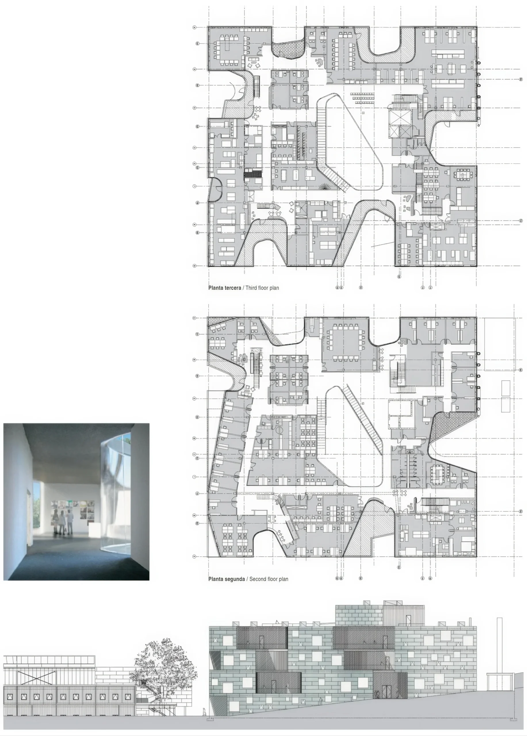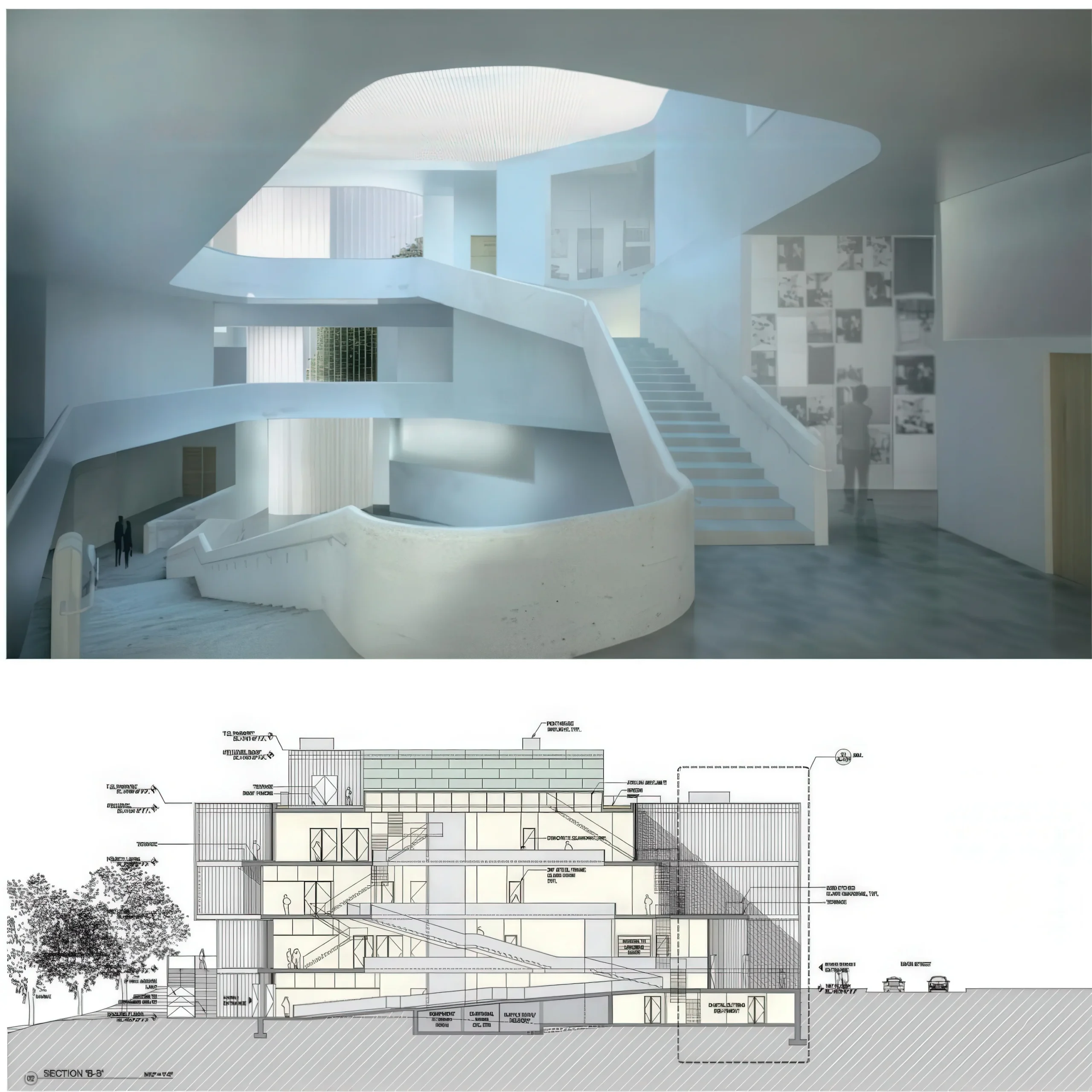 视觉艺术大楼,爱荷华大学 / Visual Arts Building, University of Iowa | 霍尔 Steven Holl 建筑学院 • 2025-11-30 下午10:48 • 公共建筑设计, 建筑师, 建筑设计, 文化建筑设计 爱荷华大学视觉艺术大楼由霍尔建筑师事务所设计,是一座四层教育建筑,为绘画、摄影、版画等艺术学科提供126,000平方英尺的开放工作室空间。建筑通过垂直孔隙和多重采光中心实现艺术学科间的互联互通,展现了当代艺术教育建筑的创新理念。 设计: 霍尔 | Steven Holl Architects 类型: 文化建筑设计 功能: 学校 风格: 当代建筑 材料: 混凝土 钢材 玻璃 金属板 尺度: 中型建筑 地点:爱荷华市 时间: 2006年 项目概述 爱荷华大学视觉艺术大楼位于美国爱荷华州爱荷华市,是一座四层教育建筑,总建筑面积126,000平方英尺。该项目由霍尔建筑师事务所设计,主要为绘画、摄影、版画、跨媒体和三维艺术等学科提供开放工作室空间,旨在促进艺术学科间的交叉融合。 设计理念 霍尔建筑师事务所通过”垂直孔隙”概念回应艺术教育的互联需求。设计采用垂直切割的开放楼层平面,创造视觉联系和空间互动,同时呼应校园网格与河流有机形态的对话,定义出新的”艺术草坪”校园空间。 空间与功能 建筑组织围绕七个垂直采光中心展开,各楼层通过错层几何形成多个阳台和室外工作空间。楼梯设计为垂直社交凝聚器,配备休息平台和家具,走廊则作为水平交流空间,促进不同艺术专业学生的自发互动与创意交流。 材料与技术 建筑采用穿孔混凝土框架结构提供热质量,配合气泡板辐射供暖冷却系统。东北和西北立面使用风化蓝绿色Rheinzink锌板,东南和西南立面采用喷砂不锈钢穿孔表皮以阻挡太阳辐射,实现自然通风和生态创新。 项目特色与启发 爱荷华大学视觉艺术大楼通过垂直孔隙和多重采光中心的创新设计,重新定义了艺术教育空间的组织模式。项目展示了如何通过建筑语言促进学科交叉,为当代教育建筑提供了空间互动与可持续发展的实践范例。 设计团队 霍尔建筑师事务所由斯蒂文·霍尔创立,以现象学建筑和空间体验设计著称。事务所在文化教育建筑领域具有丰富经验,擅长通过材料创新和光线运用创造独特的空间体验,在本项目中成功实现了艺术教育空间的革新性表达。 项目概述 爱荷华大学视觉艺术大楼位于美国爱荷华州爱荷华市,是一座四层教育建筑,总建筑面积126,000平方英尺。该项目由霍尔建筑师事务所设计,主要为绘画、摄影、版画、跨媒体和三维艺术等学科提供开放工作室空间,旨在促进艺术学科间的交叉融合。 设计理念 霍尔建筑师事务所通过”垂直孔隙”概念回应艺术教育的互联需求。设计采用垂直切割的开放楼层平面,创造视觉联系和空间互动,同时呼应校园网格与河流有机形态的对话,定义出新的”艺术草坪”校园空间。 空间与功能 建筑组织围绕七个垂直采光中心展开,各楼层通过错层几何形成多个阳台和室外工作空间。楼梯设计为垂直社交凝聚器,配备休息平台和家具,走廊则作为水平交流空间,促进不同艺术专业学生的自发互动与创意交流。 材料与技术 建筑采用穿孔混凝土框架结构提供热质量,配合气泡板辐射供暖冷却系统。东北和西北立面使用风化蓝绿色Rheinzink锌板,东南和西南立面采用喷砂不锈钢穿孔表皮以阻挡太阳辐射,实现自然通风和生态创新。 项目特色与启发 爱荷华大学视觉艺术大楼通过垂直孔隙和多重采光中心的创新设计,重新定义了艺术教育空间的组织模式。项目展示了如何通过建筑语言促进学科交叉,为当代教育建筑提供了空间互动与可持续发展的实践范例。 设计团队 霍尔建筑师事务所由斯蒂文·霍尔创立,以现象学建筑和空间体验设计著称。事务所在文化教育建筑领域具有丰富经验,擅长通过材料创新和光线运用创造独特的空间体验,在本项目中成功实现了艺术教育空间的革新性表达。 本文来自 © 建筑学院, 发布于 © 建筑学院官方网站。 未经授权,禁止转载或摘编。 编辑版本版权归 © 建筑学院官方网站 所有, 设计、图纸及照片版权归设计方 © 建筑学院 ↗ 所有。 查看作者在建筑学院发布的更多作品: 建筑学院 @ 建筑学院官方网站 Visual Arts Building教育建筑设计艺术教育空间霍尔建筑师事务所 建筑学院编辑 下载原图 收藏 0 关于作者 建筑学院编辑 关注私信 9.0K 文章 202 评论 12 粉丝 建筑学院(ArchCollege)是中国领先的建筑师移动垂直社区,成立于2012年,超过 70% 的年轻建筑师正在使用我们的产品。我们致力于通过建筑设计新媒体与在线教育平台,连接教育、行业与科技,为建筑师提供灵感与成长支持,陪伴并见证每一位青年建筑师的专业进阶与时代探索。 欧洲阿乐街办公大楼 Europaallee Office Building | 克里斯蒂安·凯雷兹|Christian Kerez 上一篇 2025-11-30 下午10:22 波特苏雷社会住房 Porto Seguro Social Housing | 克里斯蒂安·凯雷兹|Christian Kerez 下一篇 2025-12-01 下午12:00 猜你喜欢 舞与文本设计学院的扩展,伯尔尼 / Extension for the School of Dance and Textile Design, Bern | 巴罗齐与维加建筑事务所|Barozzi Veiga 2026-04-17 公共建筑设计 大学校园系统理论模型 / Theoretical Model for a System of University Campuses | Dogma 2026-01-25 概念建筑 陶土展馆 / Clay Pavilion in Oaxaca | 阿尔瓦罗·西扎|Álvaro Siza 2026-03-05 公共建筑设计 厨房塔 / Kitchen Tower | Xaveer de Geyter 2026-02-25 公共建筑设计 巴塞尔大